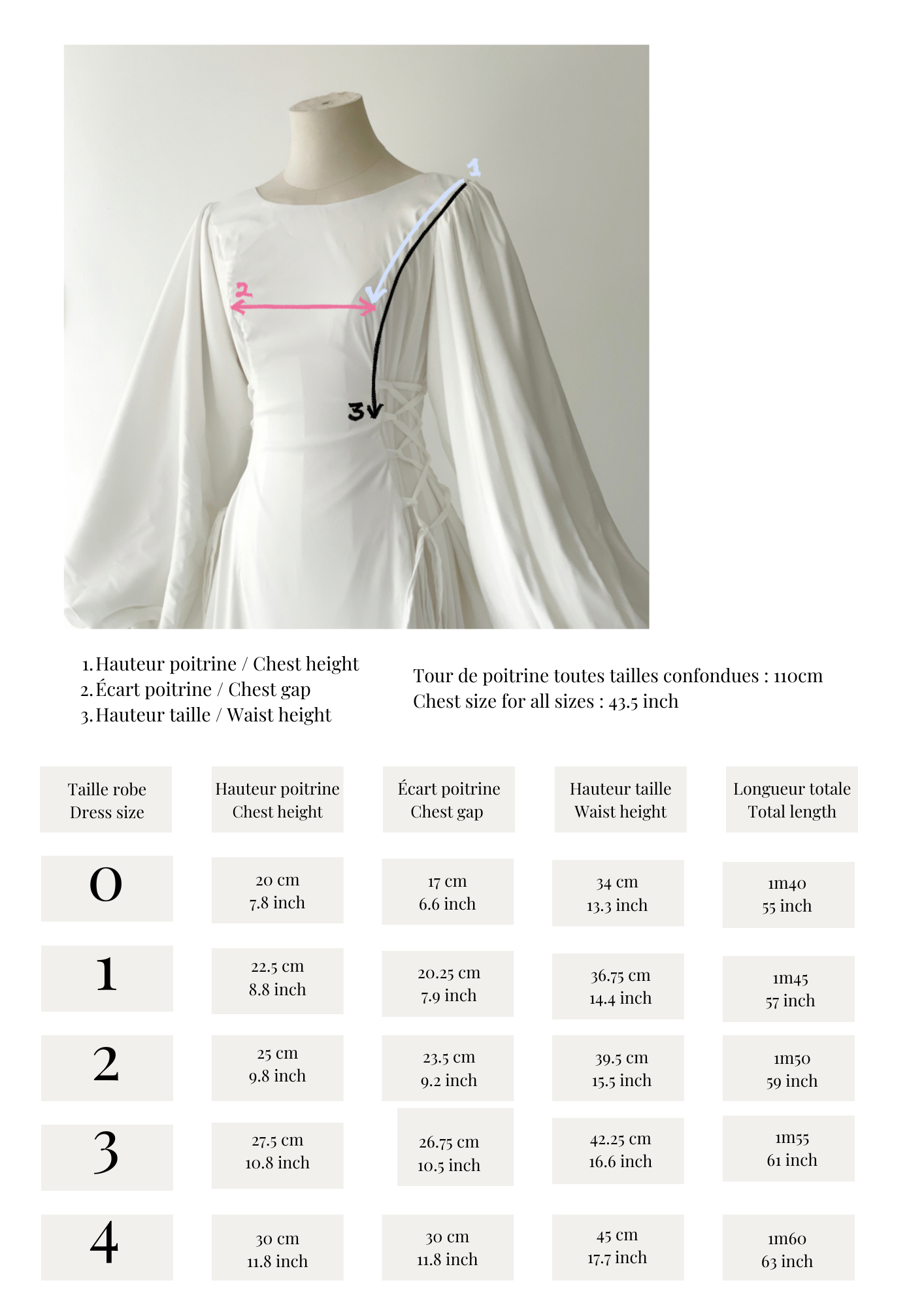 Please note: always refer to the exact measurements, the dress size recommendations (1,2,3,4) in relation to your height are only recommendations, and may vary depending on your body shape.