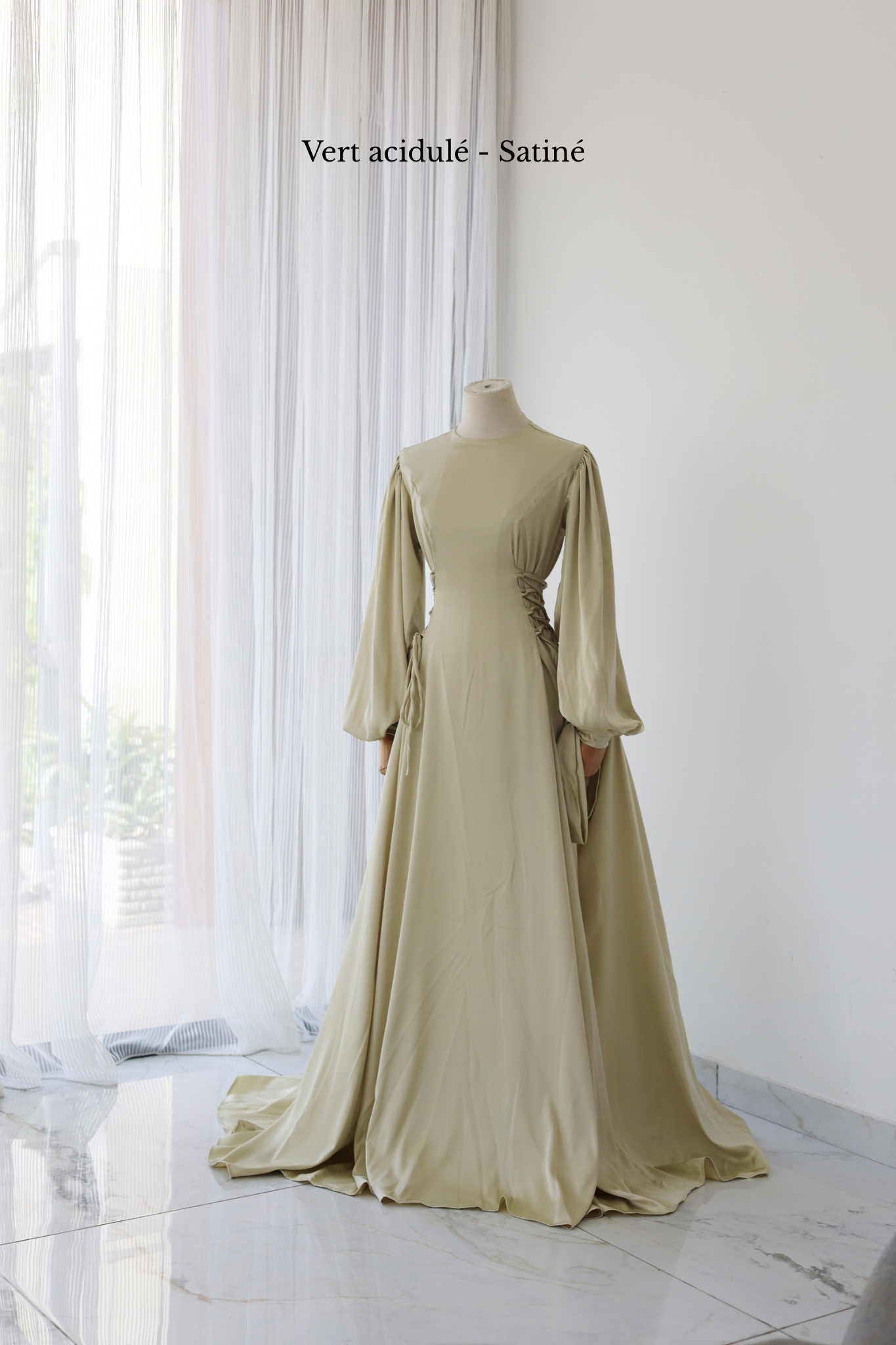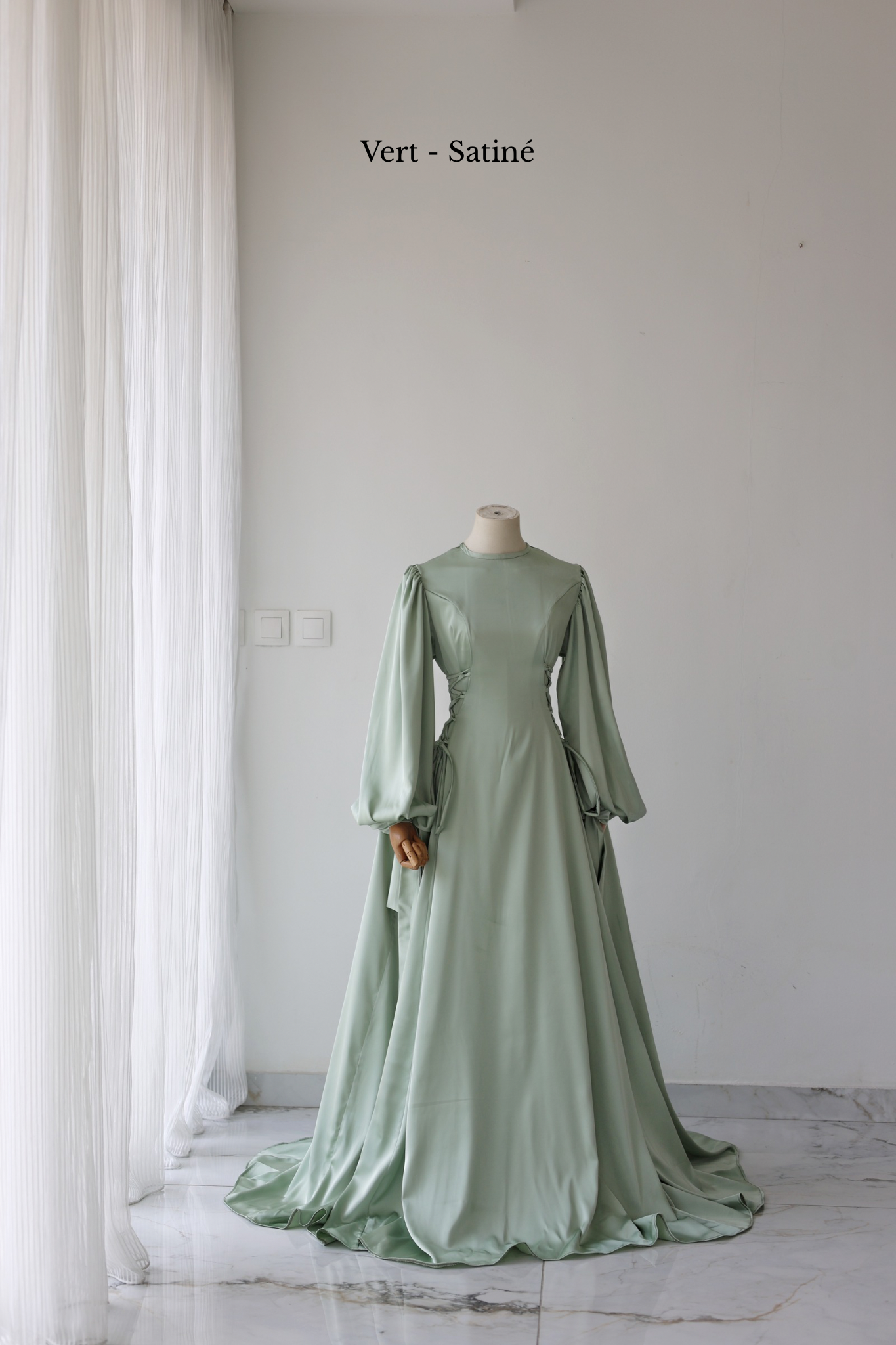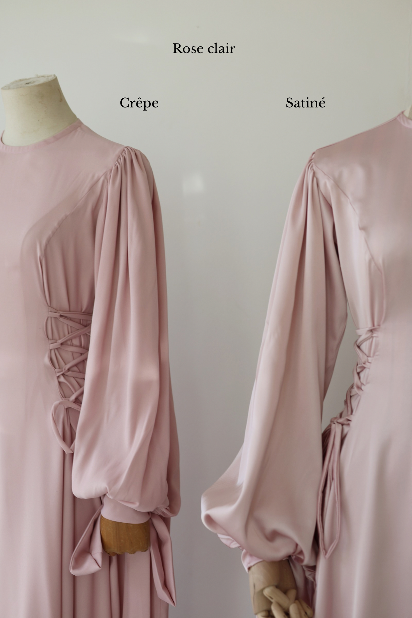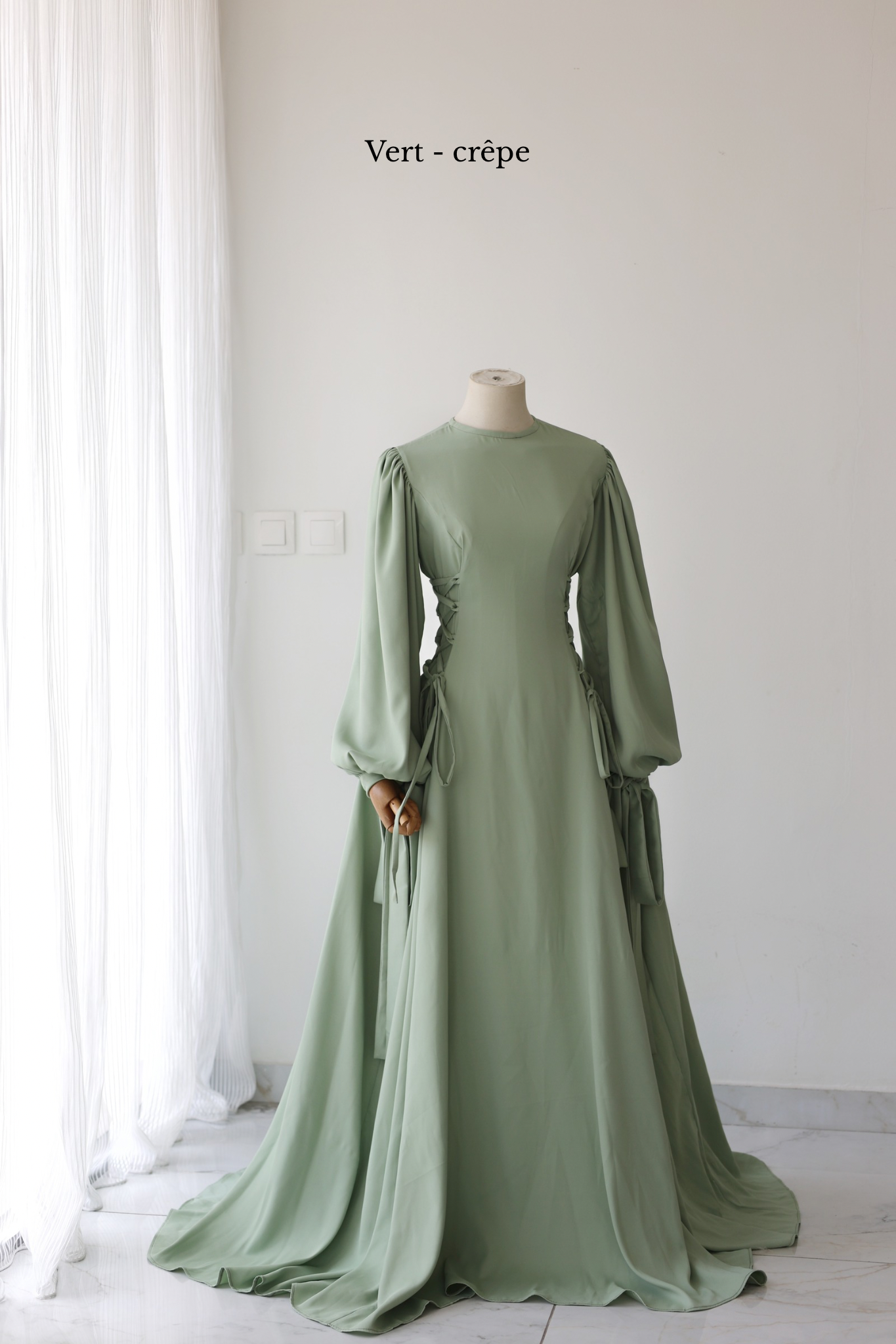 Pour montrer la largeur réelle de la robe, elle a été épinglée de part et d'autre des poignets du mannequin.