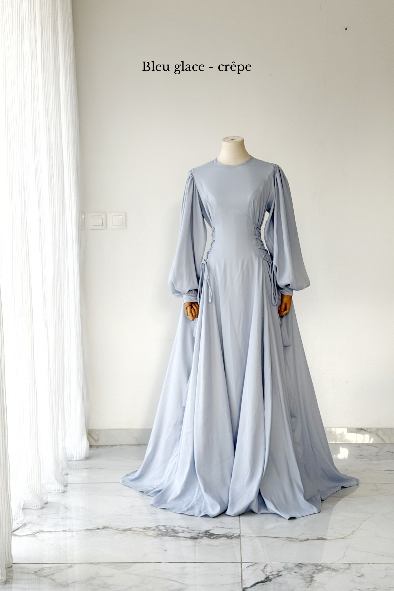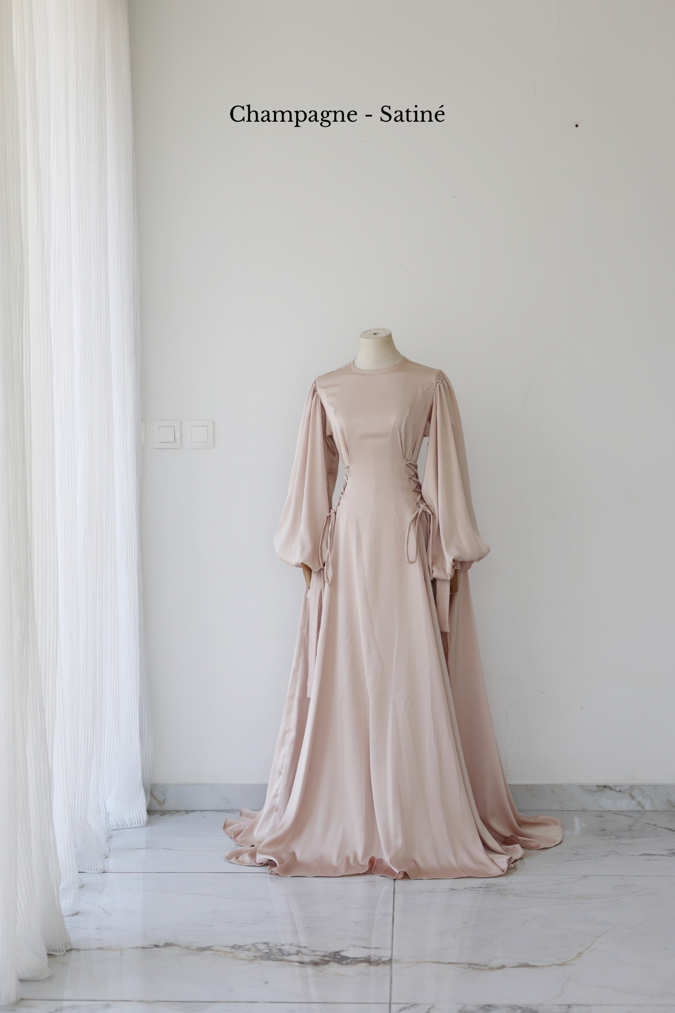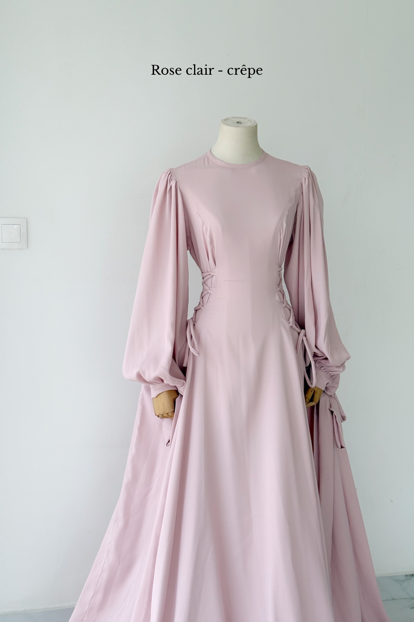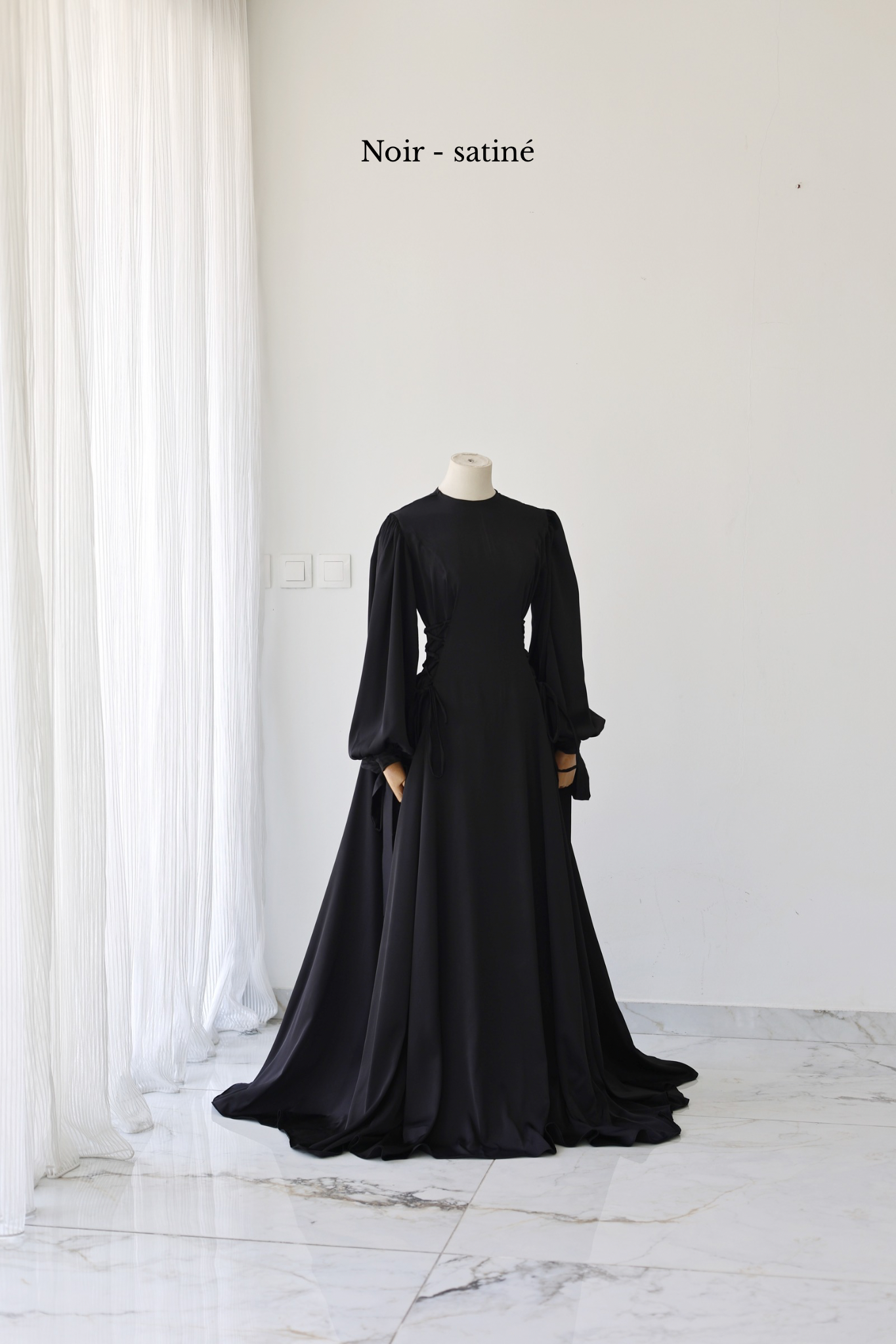 Pour montrer la largeur réelle de la robe, elle a été épinglée de part et d'autre des poignets du mannequin.