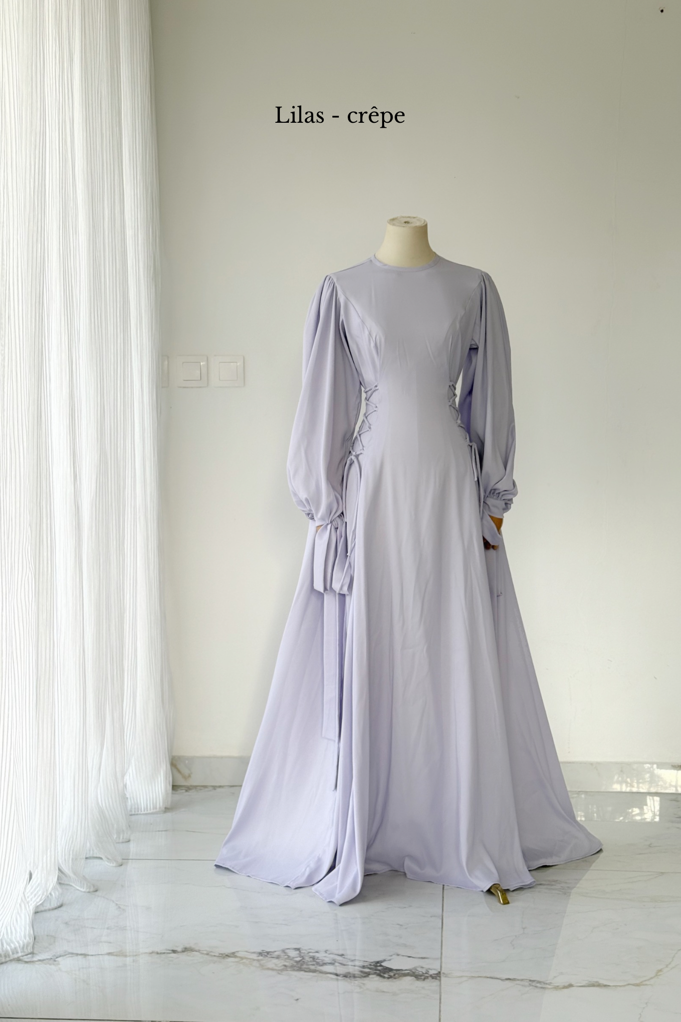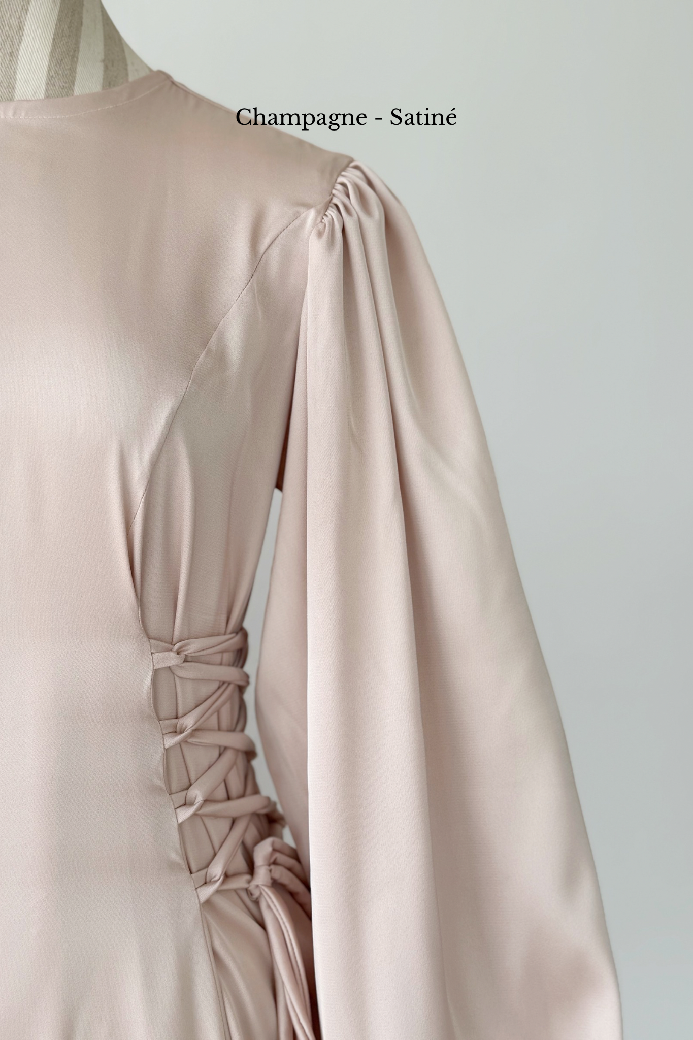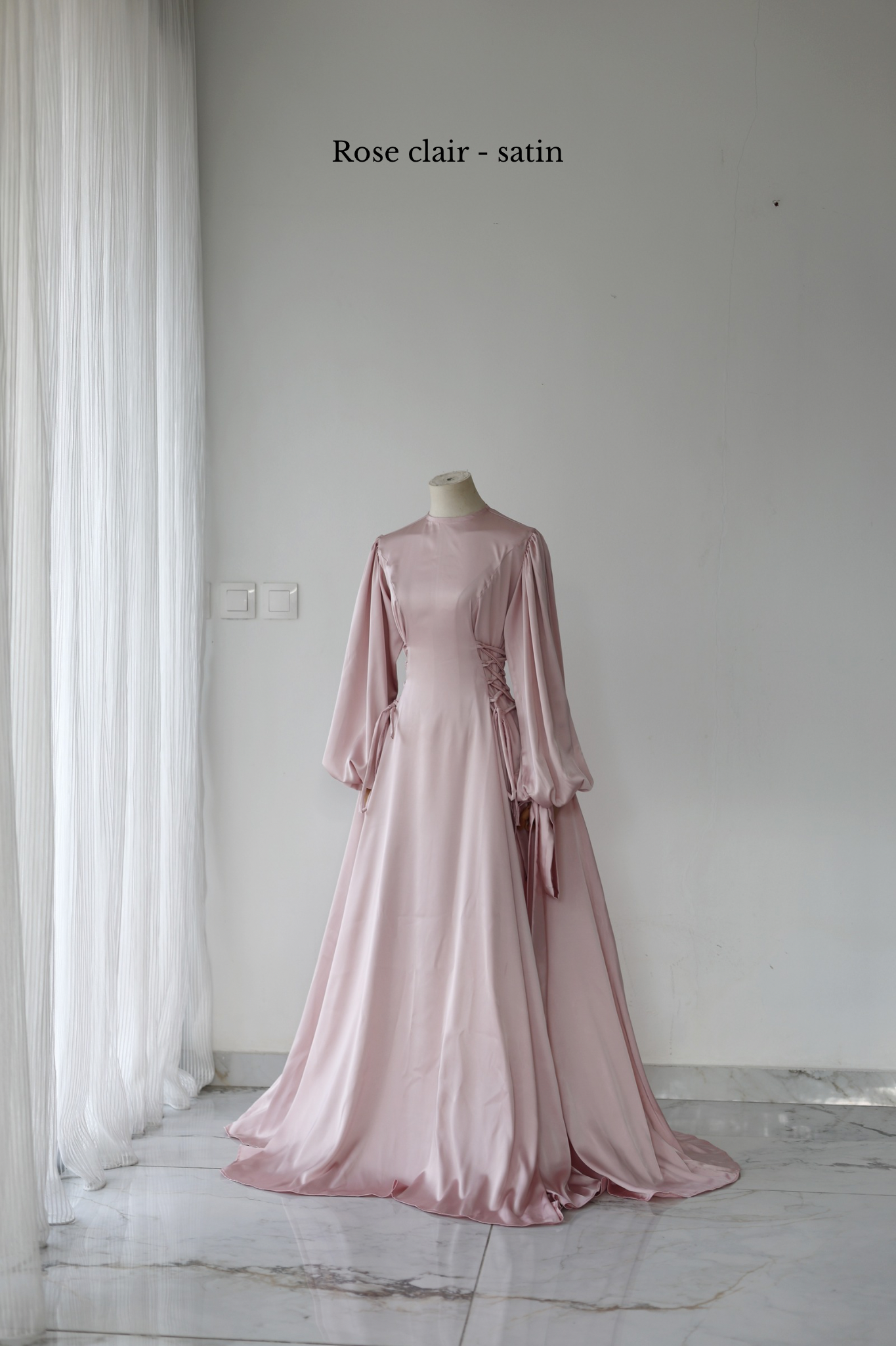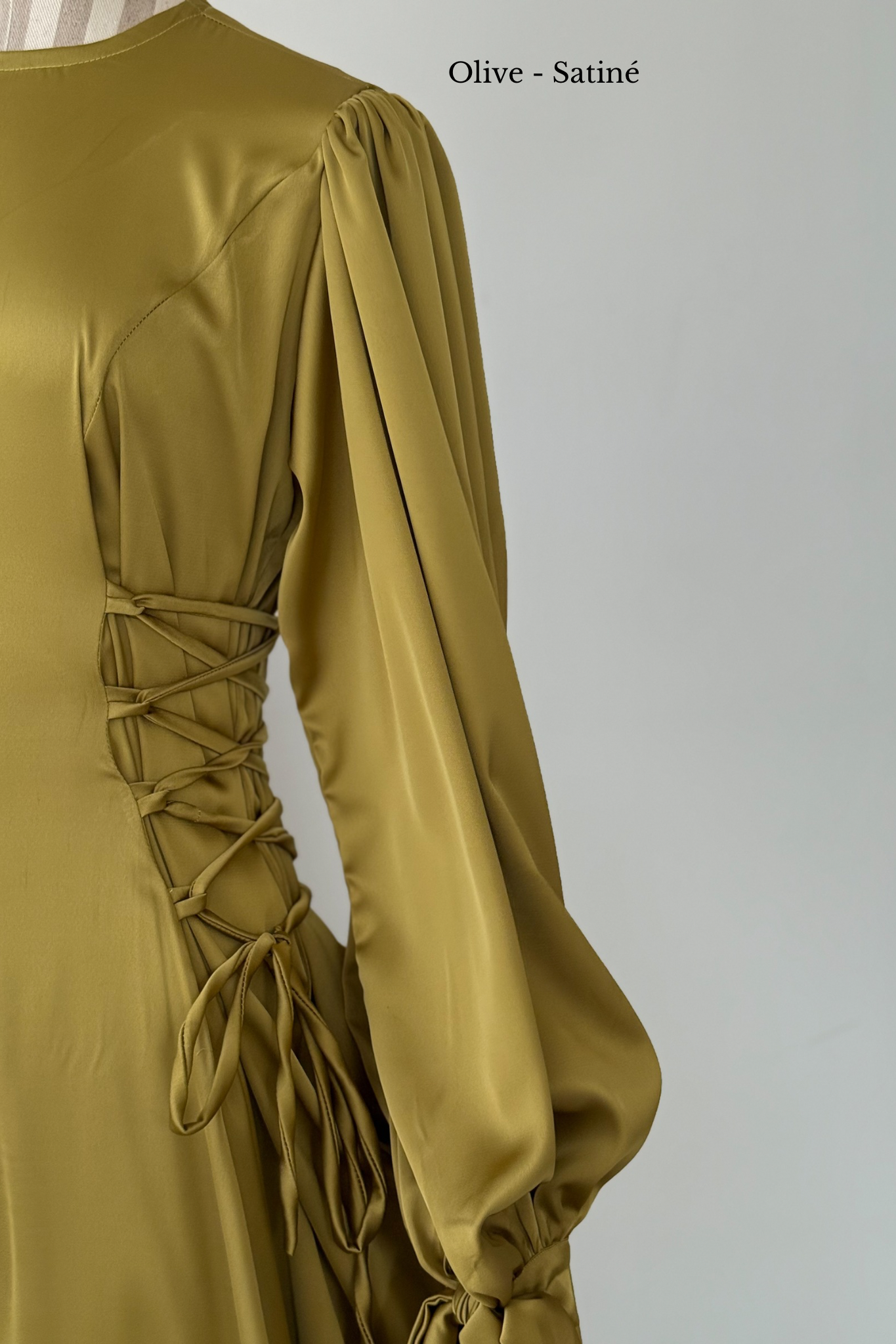 Pour montrer la largeur réelle de la robe, elle a été épinglée de part et d'autre des poignets du mannequin.