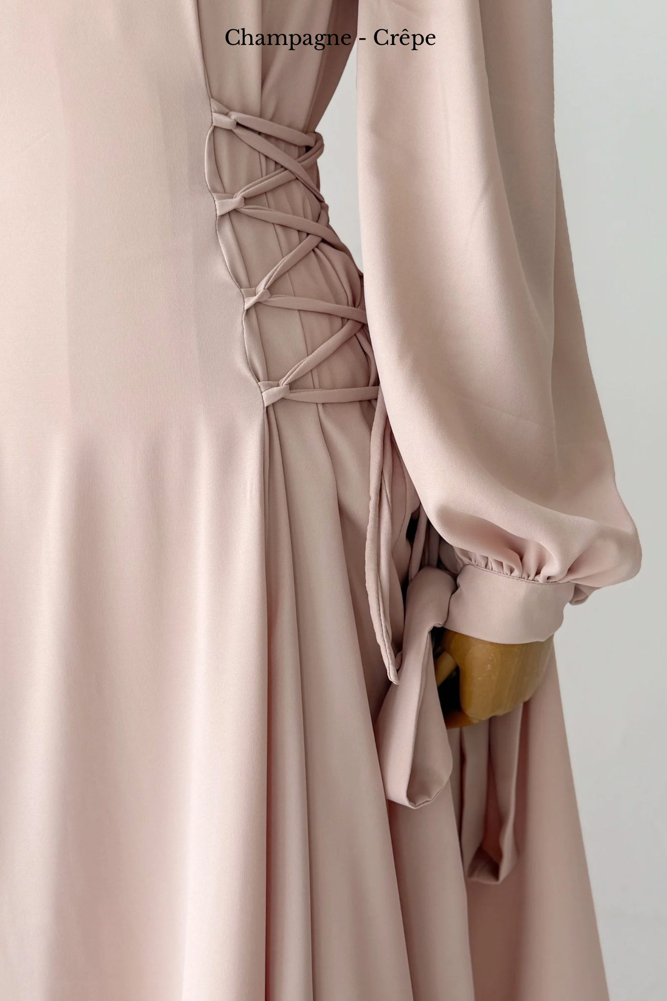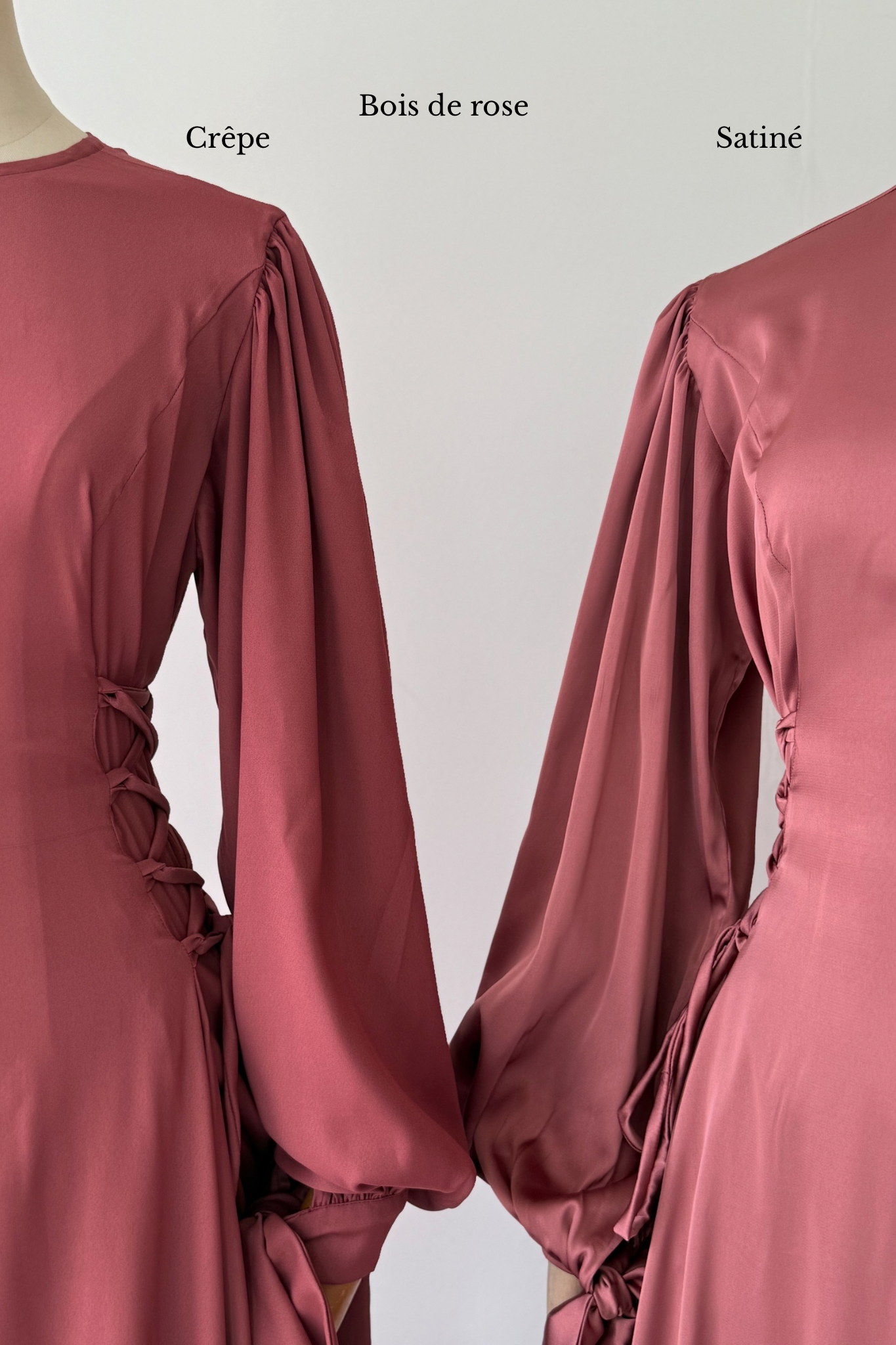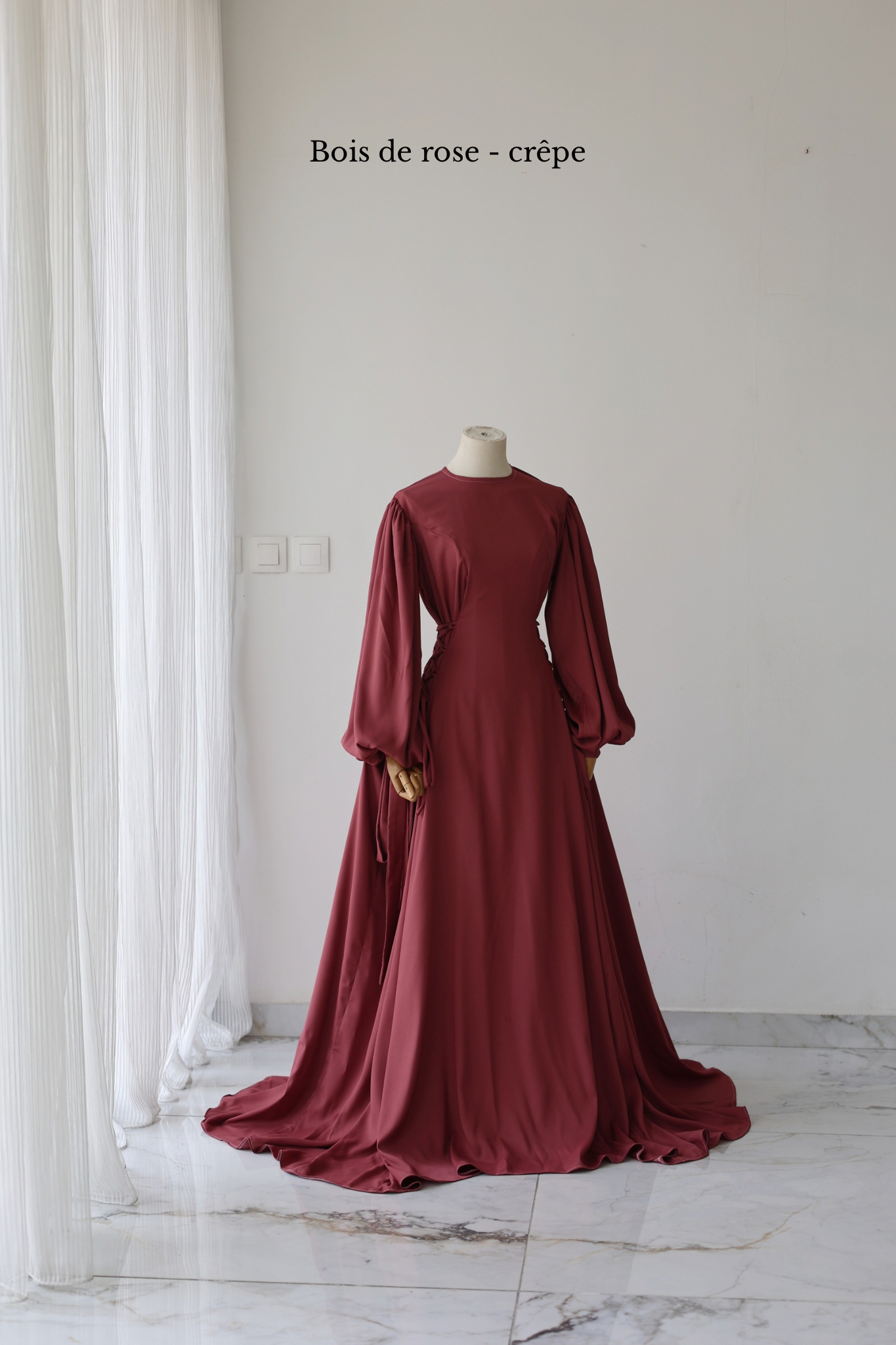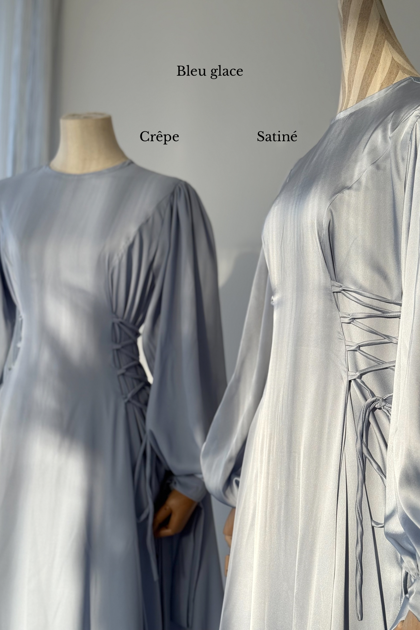 Pour montrer la largeur réelle de la robe, elle a été épinglée de part et d'autre des poignets du mannequin.